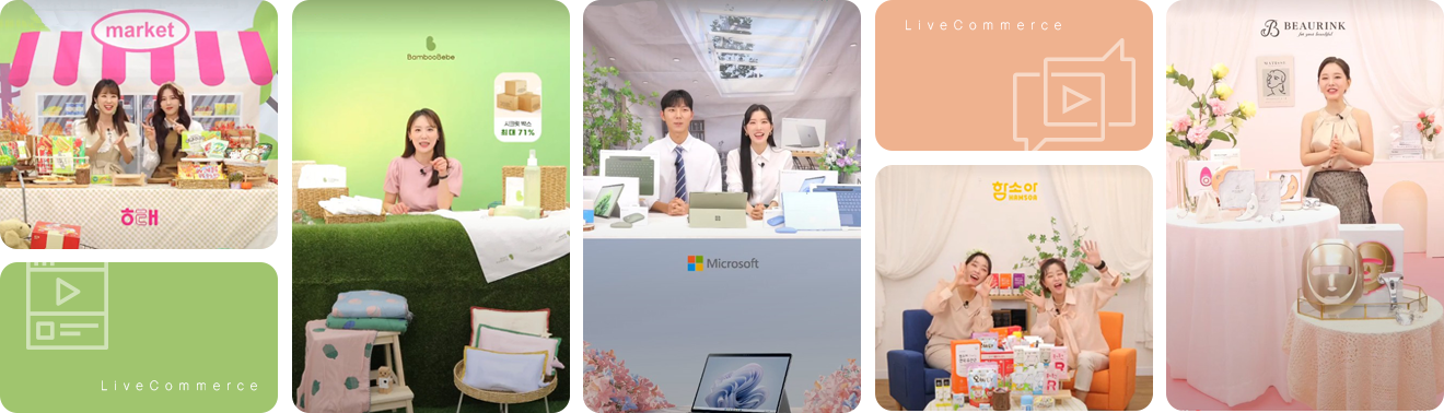 섭외/연출/기획/운영/촬영/분석 등 라이브커머스의 모든 과정이 원스텝 시스템! 브랜드 별 매니저 별도 운영으로 브랜드 이미지에 걸맞는 방송연출과 영상 디자인을 지원하며, 상품이 가장 돋보일 수 있도록 최고의 영상 퀄리티로 방송을 제작해드립니다.